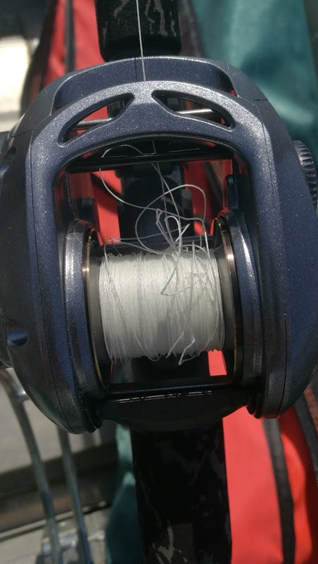 Ovo najčešće ide samo povlačenjem strune prema naprijed bez da vadiš špulu.Jesi probao? Ide teže ali se otpetlja bez problema.